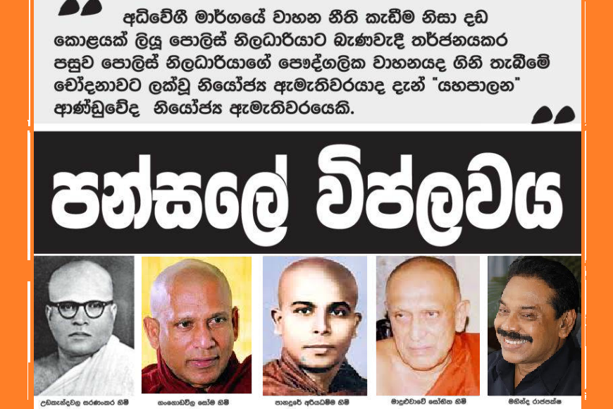 මේ අනුව ශ්රී ලංකාවේ මෑත කාලීන ඉතිහාසයේ අධිරාජ්යයට එරෙහිව හෝ මව්බිමේ නිදහස පතා විප්ලවය ඇරඹුණේ පන්සලෙනි. ශ්රී ලංකාවේ 19වැනි සියවසේ සිදුවූ ගොවිජන කැරළි පිළිබඳව අරගලයට නායකත්වය දුන්නේ පන්සලෙනි. 1816 සහ 1818 කැරළිවලදී ප්රධාන වැඩ කොටසක් කැරළි නායකයින් සමඟ ඉටුකරනු ලැබුවේ ඉහළගම රතනපාල ඇතුළු භික්ෂූන් විසින් පන්සල මුල්කර ගනිමිනි. එජාප ආණ්ඩුව මහින්ද රාජපක්ෂ ආශිර්වාද පූජා සදහා යන පන්සල් රාජදෝහී ස්ථාන ලෙස ඉදිරියේදී සලකන්නේනම් 1918 කැරැල්ලේදී හිරභාරයට ගත් අඹගොල්ලේ හිමි ඇතුළු පිරිසට බ්රිතාන්යයන් පැවසූ පරිදි ශ්රී ලංකාවේ ඇති සෑම බෞද්ධ පන්සලක්ම කුමන්ත්රණ ගුහාවකි.