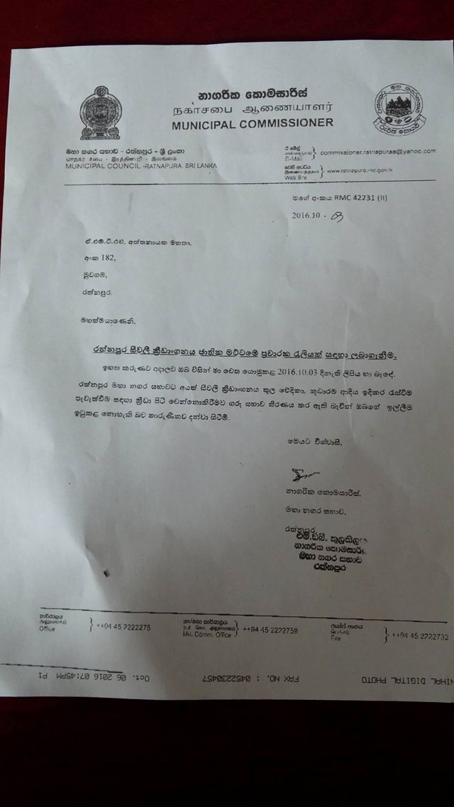[1]. රත්නපුර සීවලී ක්රීඩාංගනයේ වේදිකා කූඩාරම් ආදිය ඉදි කර රැස්වීම පැවැත්වීම සඳහා ඒකාබද්ධ විපක්ෂයට ලබා නොදෙන බව පවසමින් රත්නපුර මහ නගර සභාවෙන් නිකුත් කරන ලද ලිපිය පහත දැක්වේ.