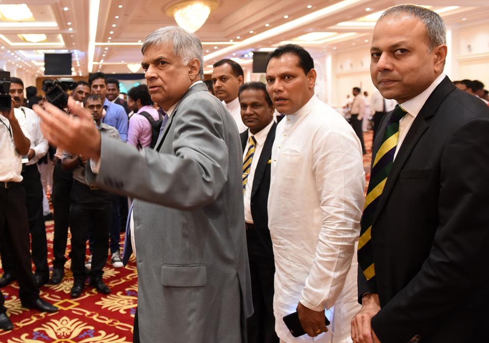 Sri Lanka Prime Minister Ranil Wickremesinghe (L), Sri Lanka Cricket president Thilanga Sumathipala (C), Sports Minister Dayasiri Jayasekera (2R) and Law and Order Minister Sagala Ratnayake (R) in Colombo on September 20, 2016. (ISHARA S.KODIKARA/AFP/Getty Images)