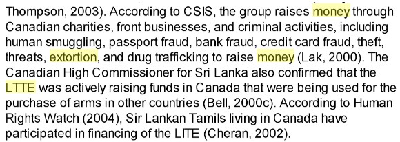 In 2006 Human Rights Watch produced a report Funding the Final War” LTTE Intimidation and Extortion in the Tamil Diaspora” covering October 2005-February 2006 using telephone and personal interviews of Tamil communities in Toronto, Canada, London, UK, Geneva, Switzerland and Germany and meetings with London Metropolitan Police, the Toronto Police, UK Foreign & Commonwealth Office, independent experts & World Tamil Movement.