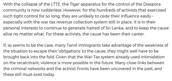 It is clear that the intelligence units and police in the very countries that LTTE has been banned have done their homework and have updated reports on the illegal activities of LTTE Tamil Diaspora. Arrests have also been made. However, a more concerted effort connecting all of the LTTE Tamil Diaspora would reveal the international network and its scope. The question is should LTTE Tamil Diaspora that had been funding LTTE over the years be allowed to dictate what and what not the Government of Sri Lanka should implement. These groups are now regular visitors to Geneva, they dictate how resolutions are drafted, they are now dictating the Government of Sri Lanka to remove military bases and whom to issue land deeds to. This is like ISIS and Al Qaeda dictating to the Western governments.