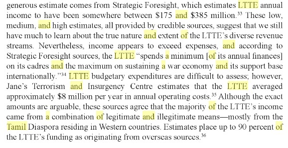 Around 20% of the LTTE’s funding came from internal sources, including extortion, taxation, and payments for protection. …. One of the main sources of internal revenue for the LTTE came from custom duties passing through areas controlled by the LTTE. These customs duties ranged from 10-30% of the cost of the items. Manoharan, N. Financial Fodder – Internal Sources of LTTE Funds.” Institute of Peace and Conflict Studies. 16 October 2004