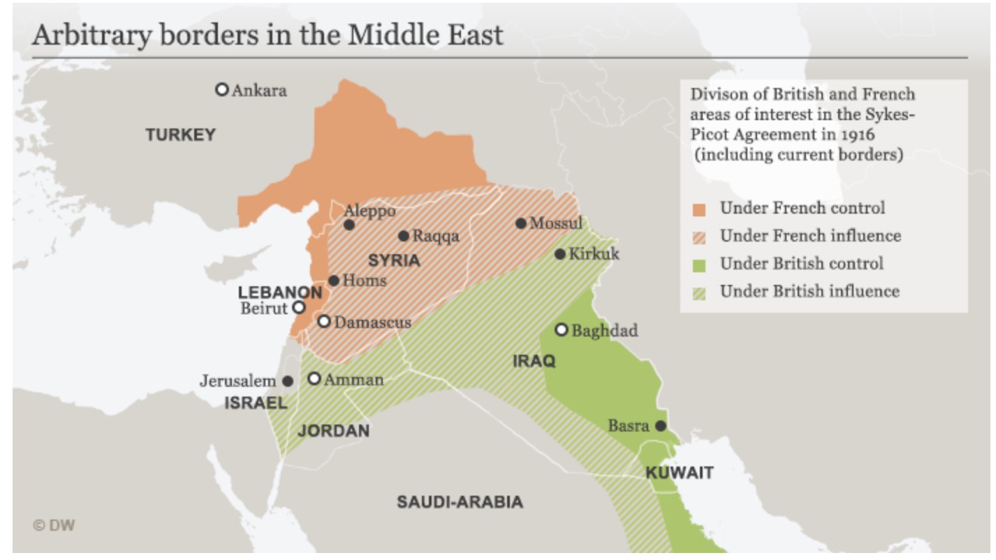 Again it was a British Sir Mark Sykes and a French Francois-Edouard Picot who were tasked to divide the Middle East between the two. It was a secret agreement. It became another example of a straight line pen drawn without any concern for the people living, their cultures or their desire to separate.