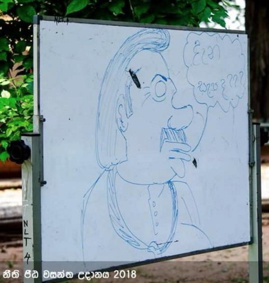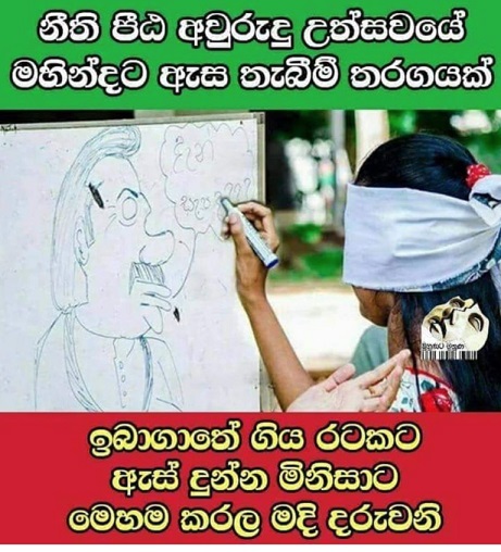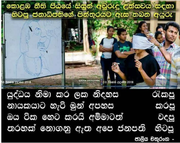 The University of Colombo Law students think they have done a job extraordinaire in the manner they have replaced the traditional Sinhala New Year festive game of placing the eye on the elephant to place the eye on the former President Mahinda Rajapakse. We do not know whose bright idea this was, but for university students in particular law students to stoop so low is utterly despicable and a disgraceful act that every citizen must deplore with condemnation. Are these the students, having benefitted from free education who are to be regarded as the future generation? In stark contrast we can compare to another state university where students and lecturers hold candle lit vigils for terrorist leader Prabakaran & LTTE terrorist cadres. These are the other lot of future coming out. Where will this country end up is our biggest question in viewing these extremes?