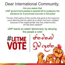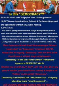 That effort has been made easy by the fact that the very forces that helped bring the regime change – from politicians, political parties, media, social media groups, lawyers, ‘academics’, ‘civil society’ etc are the very people scrambling to return the deposed former prime minister back into the saddle. Their latest propaganda is to shout #democracywins & pretend to be mouthpiece for democracy but they go mute when questioned as to why they did not oppose UNP JVP TNA passing special bills to delay elections & not holding elections from August 2015 to February 2018!