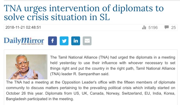 The Daily Mirror of 21 November 2018 reported that the Tamil National Alliance had urged diplomats to use their influence ‘with whoever necessary’ to put the country in the right path, whatever that means. This followed a meeting with 15 diplomats on what they all want to present as a ‘political crisis’. However, what was TNA doing throughout decades of LTTE terror not forgetting that TNA was an alliance created by LTTE in 2001? Did TNA seek intervention to stop LTTE from killing innocent unarmed people? Did TNA stop any Tamil child from being kidnapped & turned into a LTTE child soldier? What has TNA actually done for the betterment of the Tamil people? Since 2012 every budget allocation to TNA for development of the North is not spent & returns to the Treasury while TNA MPs & Chief Minister love to travel the world on a complaining campaign crying crocodile tears on slow development in the North. Tamils are waking up to the TNA lies & will be in for some surprising outcomes soon.