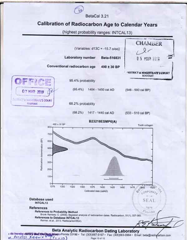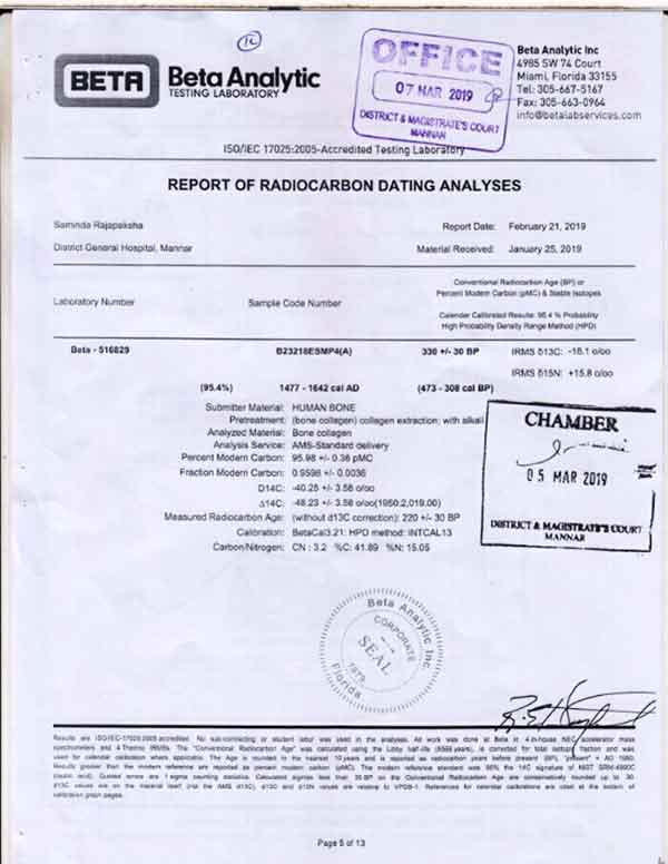මේ අනුව ඇමරිකාවේ ෆෝරීඩාහි පිහිටි බීටා ඇනලටික් නැමති රසායනාගාරයට ලබා දුන් මන්නාරම් සමූහ මිණීවලෙන් රැගත් සාම්ඵල 6ම වාර්ථාව අද දින පසිද්ධියට පත් කරමින් එලි දක්වා තිබුනේ සමූහ මිණීවලේ ඇටසැකිලි වල කාල නිර්ණය අනුව වර්ෂ1400 ත් 1719ත් අතර කාලයේදී බවට පෙන්වා දී ඇත.