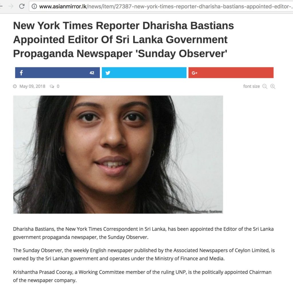 She was appointed Editor of Sunday Observer by yahapalana government but resigned after Ranil Wickremasinghe was sacked as PM in October 2018 and Mahinda Rajapakse appointed as PM.