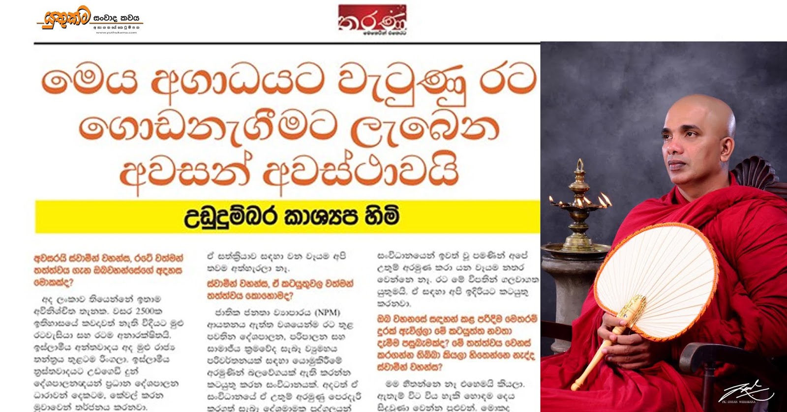 o අද ලංකාව තියෙන්නේ ඉතාම අවිනිශ්චිත තැනක. වසර 2500 ක ඉතිහාසයේ කවදාවත් නැති විදියට මුලු රටවැසියා සහ රටම අනාරක්ෂිතයි. ඉස්ලාමීය අන්තවාදය අද මුලු රාජ්‍ය තන්ත්‍රය තුලටම රිංගලා. ඉස්ලාමීය ත්‍රස්තවාදයට උඩගෙඩි දුන් දේශපාලඥයන් ප්‍රධාන දේශපාලන ධාරාවන් දෙකටම, කේවල් කරන මුවාවෙන් තර්ජණය කරනවා. ජනාධිපතිවරණයේදී දෙන සහයෝගය දඩමීමා කරගෙන ගිවිසුම් වලට හිර කරවන්න හදනවා. රටේ පුරාවස්තු, බෞද්ධ සිද්ධස්ථාන ඉතාම වේගයෙන් ඉස්ලාමීය අන්තවාදයට යටවෙමින් යනවා. අනෙකුත් වර්ගවාදයන්ද මතුවෙමින් බුදු දහමට සහ ධර්මයේ පැවැත්මට තර්ජණයක් වෙමින් තියෙනවා. රටේ පාලක පක්ෂය මහා සංඝරත්නය ප්‍රමුඛ ආගමික නායකයන්ට එරෙහිව විවිධ දෝෂාරෝපණ නගමින් මෙහෙම නිග්‍රහයට පත්කරපු කාලයක් ඉතිහාසයේ තිබ්බෙ නැති තරම්. රටතුල හැම අංශයකම පරිහානියක් මිස වර්ධනයක් දකින්නට නැති අවිචාර සමයක් තමා මේ ගෙවිලා යන්නේ.