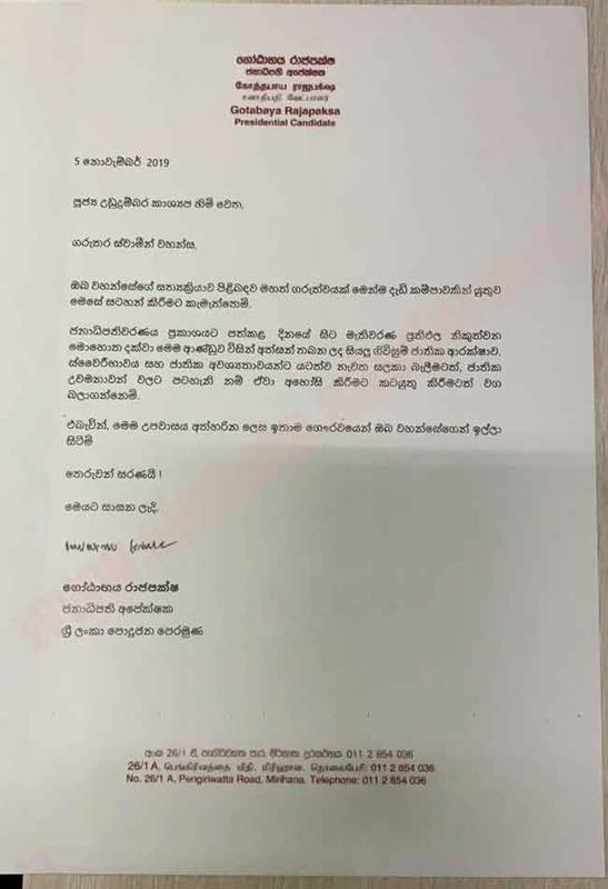 The letter issued by SLPP presidential candidate Gotabaya Rajapaksa is as follows: