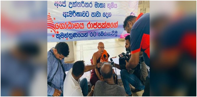 Dr. Inguruwatte Sumangala Thero began a fast unto death demanding SLPP produce documentary evidence to prove revocation of US citizenship, otherwise, he will continue his fast unto death. His banners read in Sinhala, meaning Save our country from the conspiracy by Gotabaya Rajapakse who is attempting to betray our Great Mother Land to America”.