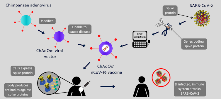 The original adenovirus causes common cold in chimpanzees and it rarely, if ever, infects humans. The virus is further modified to ensure that this chimp virus cannot grow in people. The AstraZeneca vaccine uses the modified virus as a vehicle to deliver the COVID-19-causing spike or S-protein of the SARS-CoV-2 virus.