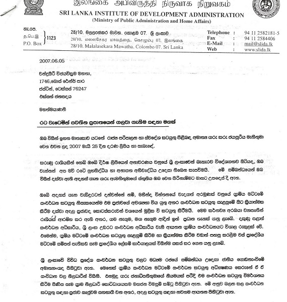 ඔබතුමාට මෙම භාරධූර ජාතික මෙහෙවර භාරදීම සම්බන්ධයෙන් මා සතුටට පත්වෙන්නේ ජන සභා අදහසේ වටිනාකම සම්බන්ධයෙන් සංදේශයක් දැනට බොහෝ කලකට පෙර (2007/5/28) මා විසින් ඔබතුමා මහින්ද රාජපක්ෂ ආණ්ඩුවේ ස්වදේශකටයුතු ඇමතිව සිටියදී ඉදිරිපත් කල නිසාය. <රට වැටෙමින් පවතින ප්රපාතයෙන් ගලවා ගැණීම සඳහා මඟක්> යන එම සංදේශයෙන් යෝජනාකලේ ග්රාම සේවක වසම් මට්ටමින් දත්ත රැස්කරමින් පක්ෂ දේශපාලනයෙන් තොර ගම් මට්ටමේ මහජන ව්යාපාරයක් ගොඩ නැඟීමේ අඩිතාලමක් දැමීමය. ඒ සම්බන්ධයෙන් ඔබගේ නිලධාරියෙක් (ටී. එම්. කේ. බී තෙන්නකෝන්, අධ්යක්ෂ, ශ්රී ලංකා සංවර්ධන පරිපාලන ආයතනය), එවූ ලිපියේ මුල් පිටුව මෙහි පහතින් කොපිකර ඇත.