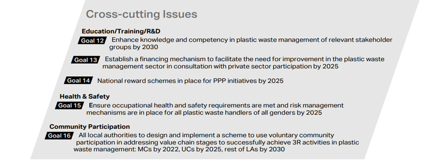 The plan is based on the government’s national policies and the waste hierarchy, and it is a comprehensive plan with goals assigned to the reduction, reuse, recycling, and final disposal of plastic waste. Very importantly it has identified goals for several important cross cutting issues as shown in the illustration below,