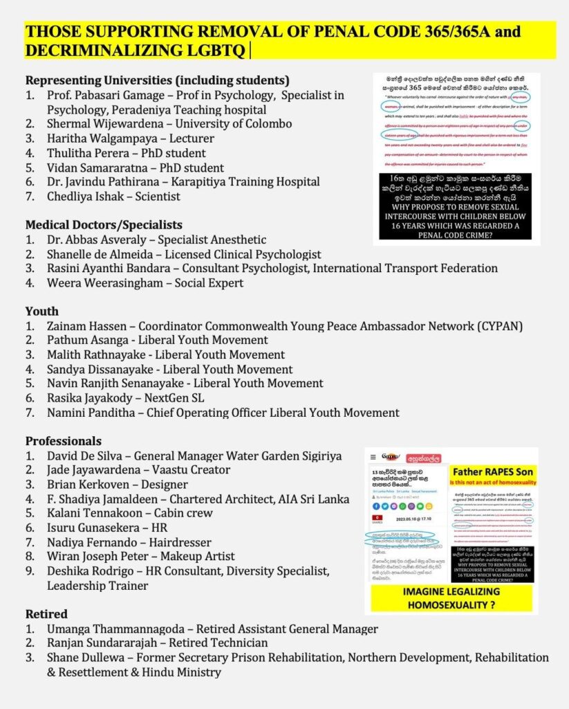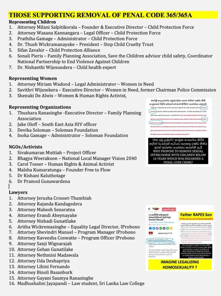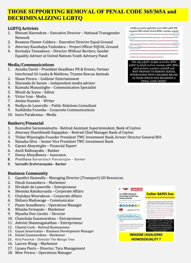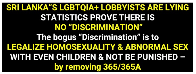 Presenting 365A as a discrimination” the LGBTIQA lobbyists want to completely remove this provision. HRCSL are also happy to oblige. Once again look at the list of prominent names who are also agreeable!
