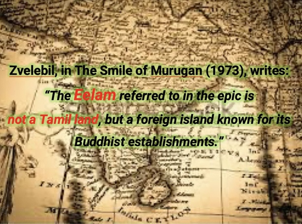 Zvelebil, in The Smile of Murugan (1973), writes: The Eelam referred to in the epic is not a Tamil land, but a foreign island known for its Buddhist establishments.”