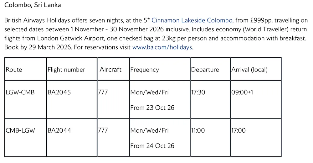 Launching on 23 October 2026, British Airways will fly three times per week from London Gatwick to Colombo, the vibrant gateway to Sri Lanka. The route will operate for the winter season only.