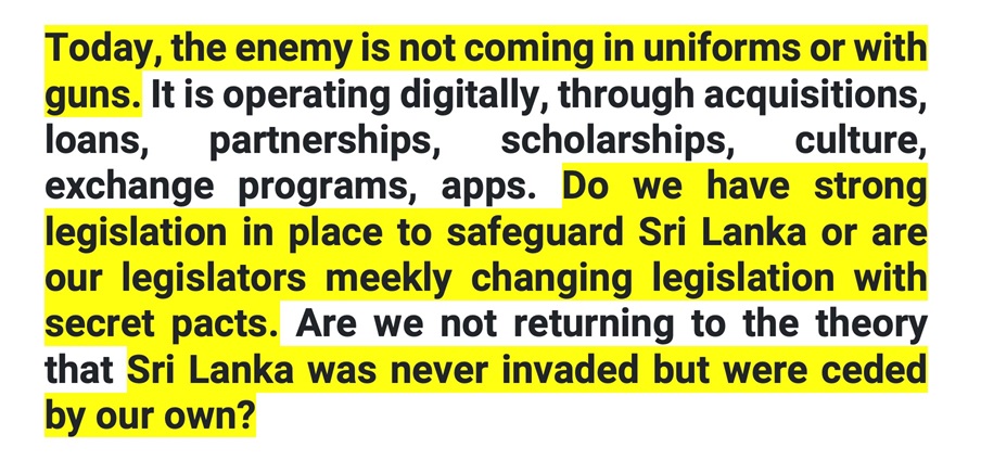 Today, the enemy is not coming in uniforms or with guns. It is operating digitally, through acquisitions, loans, partnerships, scholarships, culture, exchange programs, apps. Do we have strong legislation in place to safeguard Sri Lanka or are our legislators meekly changing legislation with secret pacts. Are we not returning to the theory that Sri Lanka was never invaded but were ceded by our own?